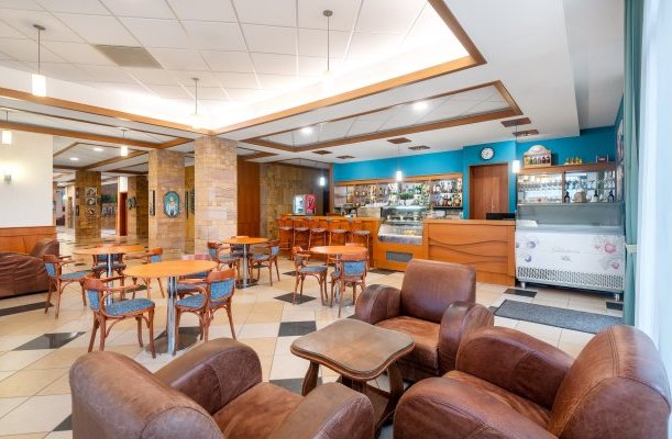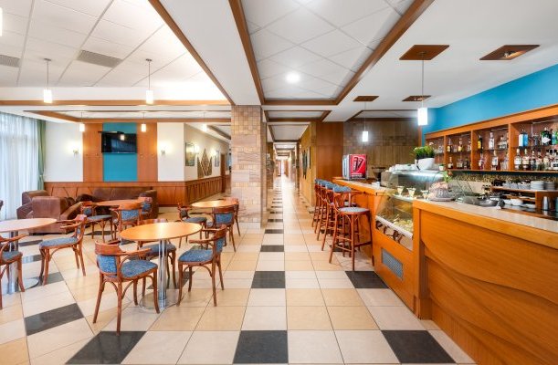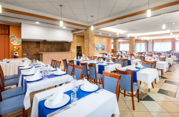 Das Restaurant Aquarell kann bis zu 180 Personen Platz bieten. Auf seinem Buffettisch finden sich die nach den Prinzipien der modernen Ernährung zubereiteten Speisen und auch traditionelle und regionale Gerichte. Die Getränkekarte bietet eine breite Auswahl an Weinen des Tieflands und seiner Umgebung. Im Erdgeschoss des Hotels befindet sich das Café, in dem verschiedene Kaffeespezialitäten, Tees, regionale kalte Küche und Süßwaren angeboten werden. Der Raum kann 40 Personen Platz bieten. Außer dort können in sonnigen Monaten weitere 30 Gäste auf der Terrasse mit Blick auf das Bad Platz nehmen.