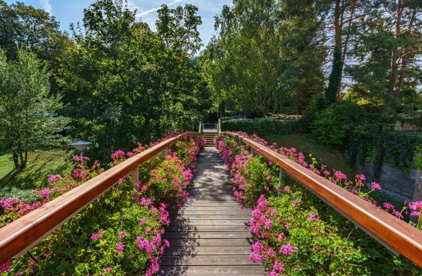 Erlebnisbad im Garten: 30 °C-os, 200 m2 groß, zum Schwimmen nicht geeignet, Freibad, kann im Winter auch benutzt werden