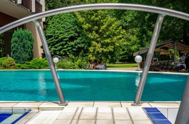 Thermalbecken im Garten: 30 °C-os, 13.5m x 8m groß, zum Schwimmen geeignet, Freibad, kann im Winter auch benutzt werden, Thermalbad
