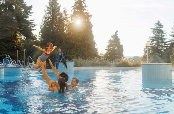 Outdoor- und Indoor Erlebnisbecken: 30 °C-os, 200 m2 groß, zum Schwimmen nicht geeignet, Freibad, kann im Winter auch benutzt werden