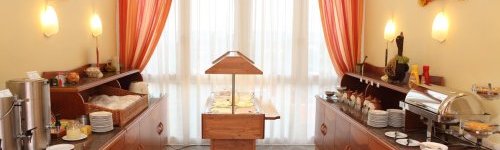 Das Frühstücksbuffet kann im dritten Stock des Hotels genossen werden.