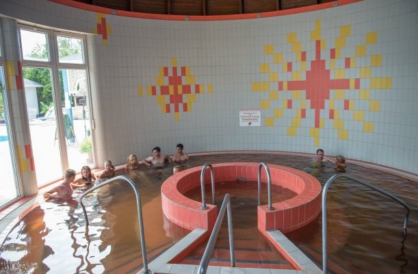 Heilwasserbecken in dem Neubau: 36 °C-os, 8m x 8m groß, zum Schwimmen nicht geeignet, Freibad, kann im Winter auch benutzt werden, Thermalbad