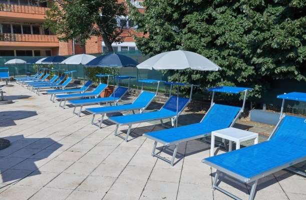Erlebnisbad in dem Hauptgebäude: 28 °C-os, 21m x 21m groß, zum Schwimmen geeignet, Freibad