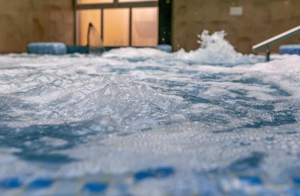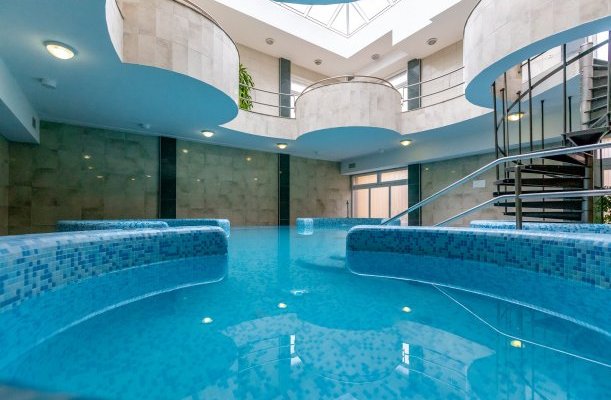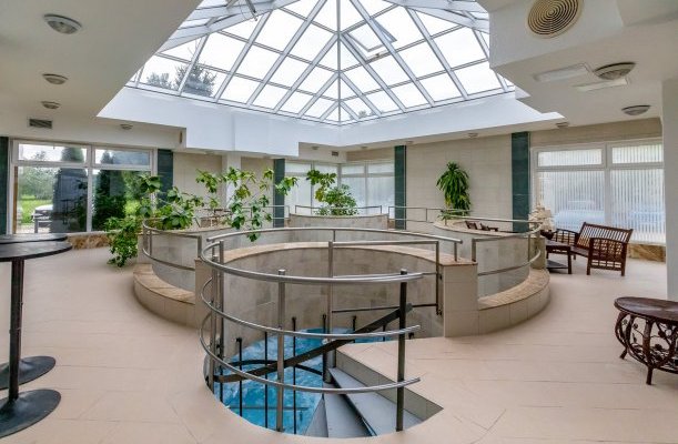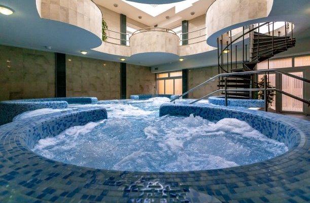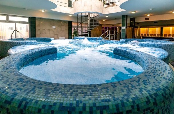 Erlebnisbad mit Thermalwasser: 34 °C-os, 100 m2 groß, zum Schwimmen nicht geeignet, Hallenbad