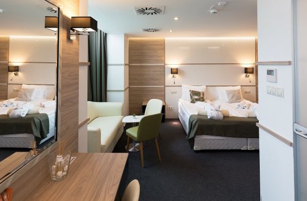 - unbegrenzte Beutzung des Bade- und Saunabereichs: Massage- und Erlebnisbecken, Erlebnisduschen, Dampfkabine, Aroma-Finnische und Infrarotsauna mit Salzziegeln